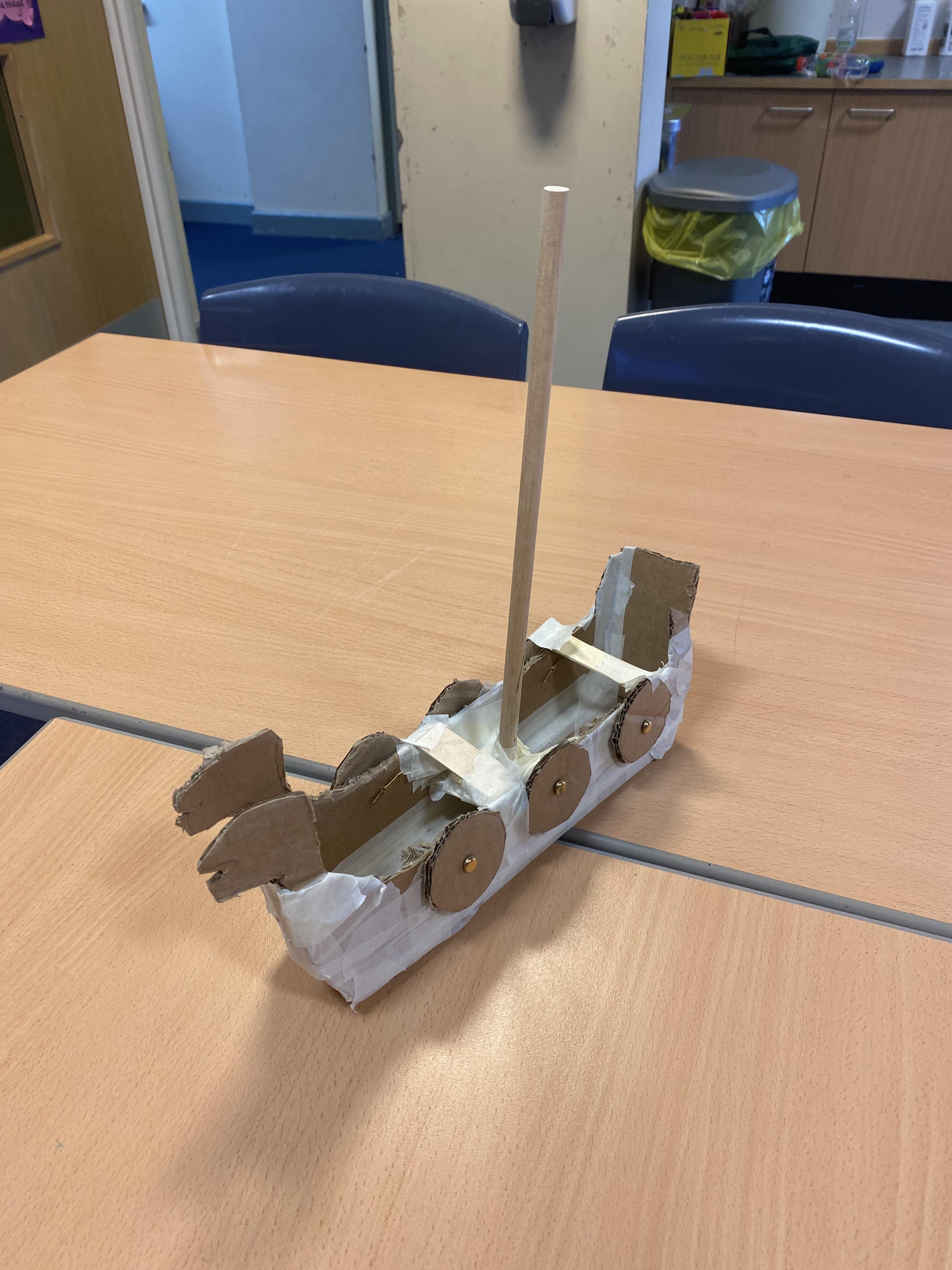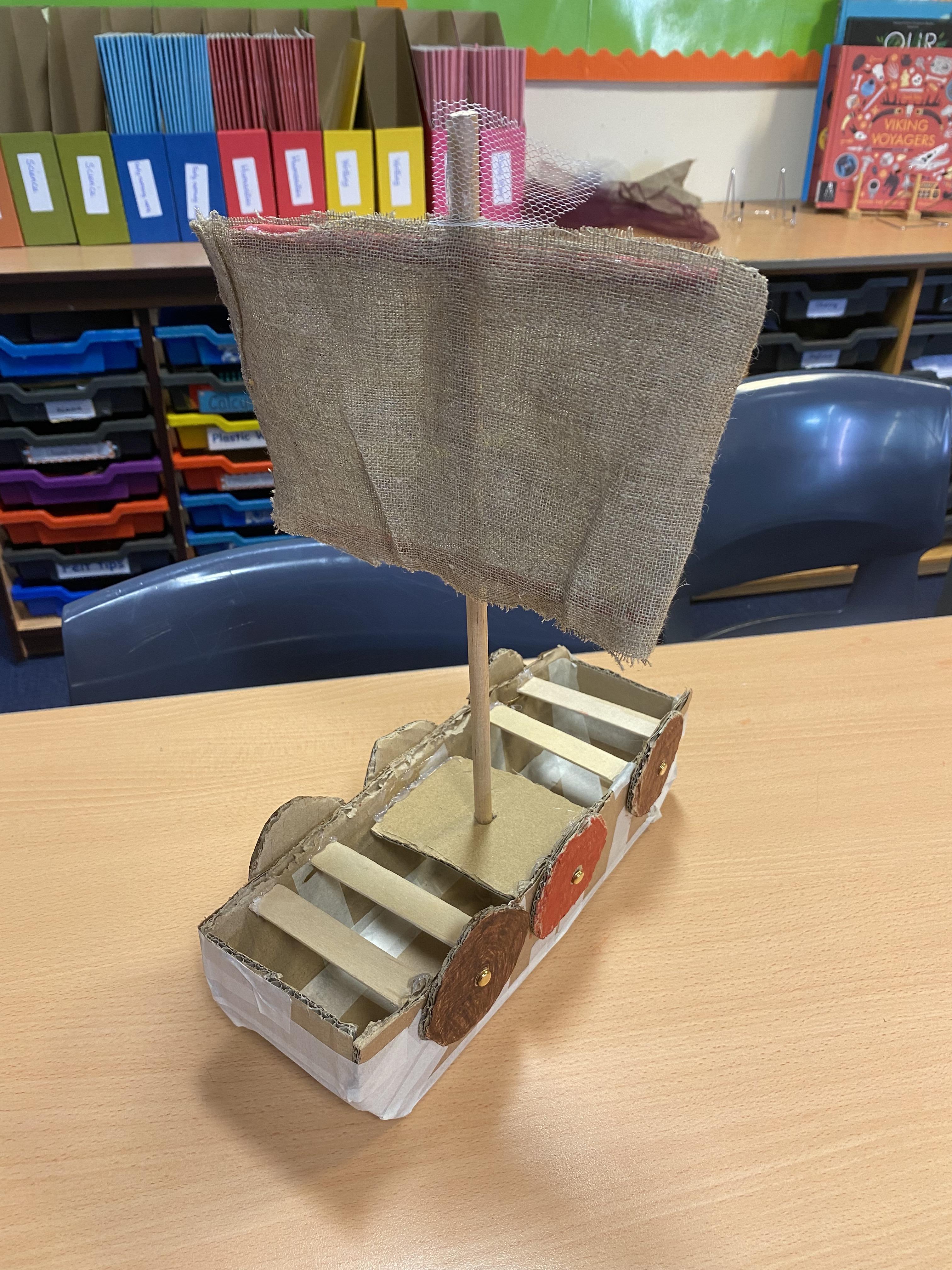 We researched Viking longships, then designed and made our own. We used tools such as hacksaws and bradawls. We did lots of measuring and also used sewing skills.